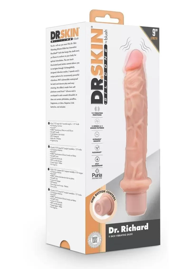 The Dr. will see you now! This Dr. Skin Vibrating Silicone Dildo has innovative FlexiShaft tech that keeps the shaft erect, yet flexes to conform to your body for optimal stimulation. The one touch illuminated push button control allows you to navigate through 10 thoughtfully designed vibration modes, 5 speeds and 5 unique patterns for uncommonly powerful vibrations. IPX7 submersible waterproof for bath and shower play and easy cleaning, this dildo is made from soft platinum-cured Puria silicone and is enveloped in satin smooth Ultrasilk. It does not contain phthalates, paraffins, fragrances, or latex. Requires 2 AA batteries, not included.