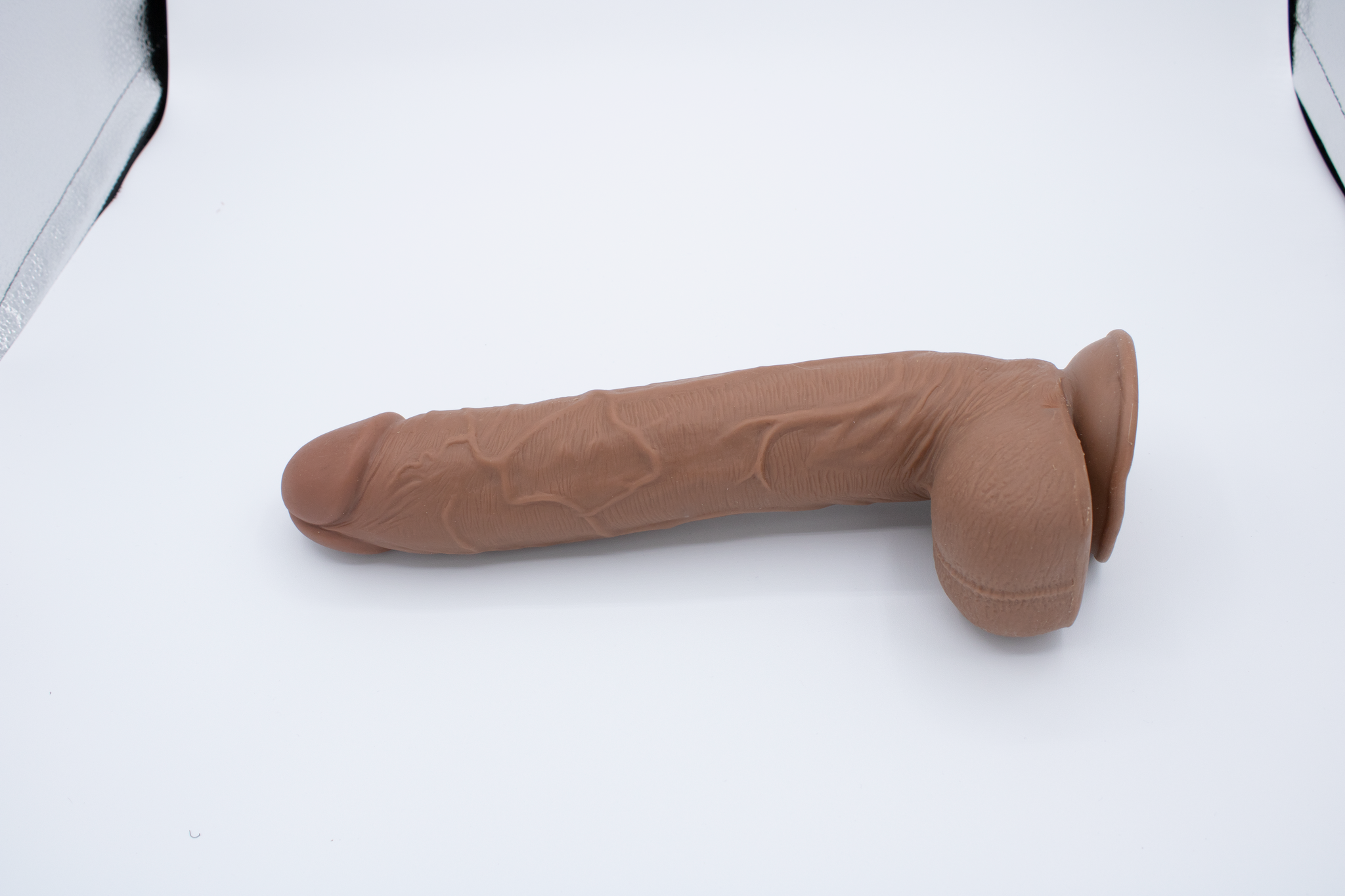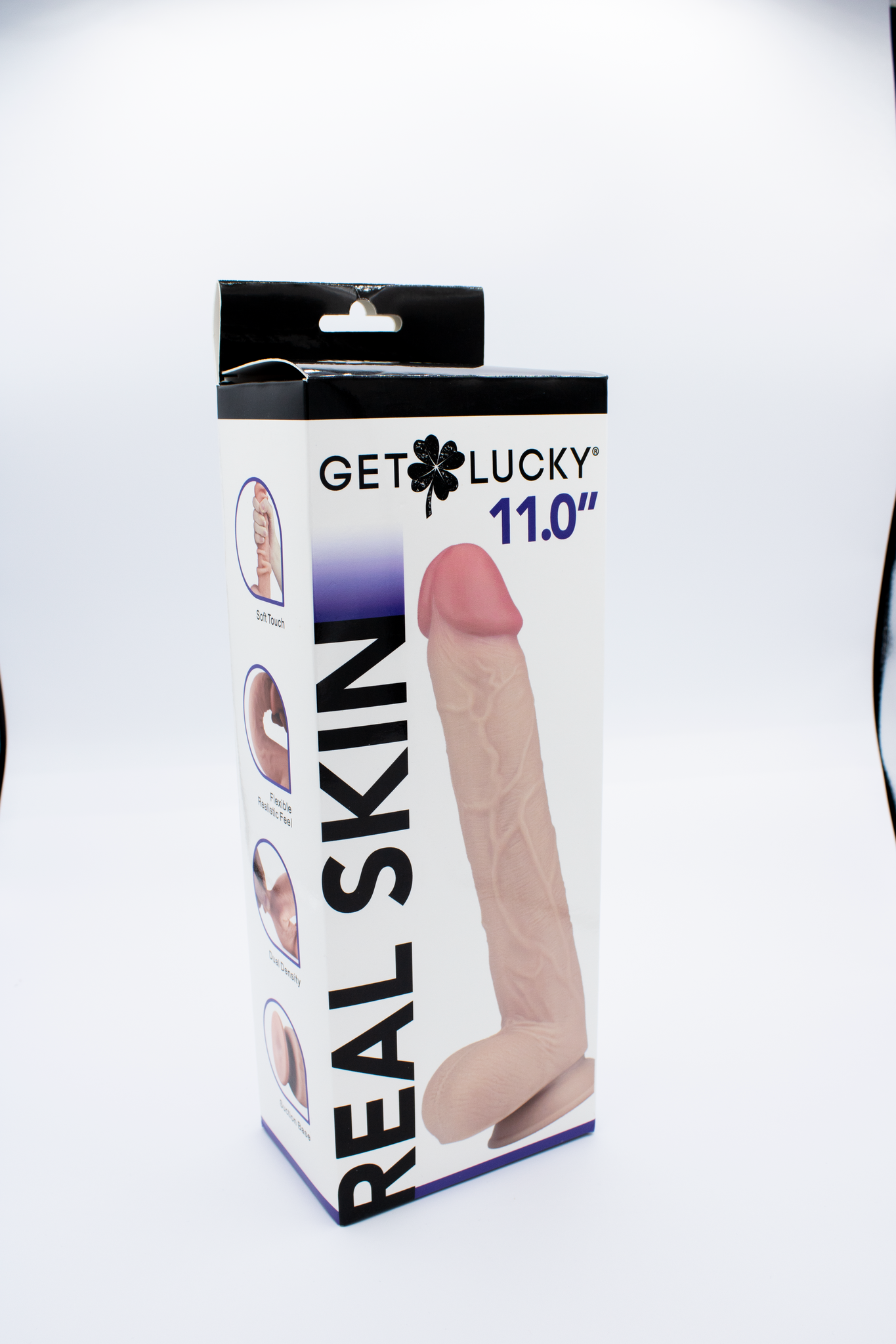Get Lucky 11" dildo is made with dual layered sliding skin material for a lifelike feel. Special dual density technology simulates the feeling of an erect penis. Easily bends to any shape. Use with a waterbased lubricant for added comfort.