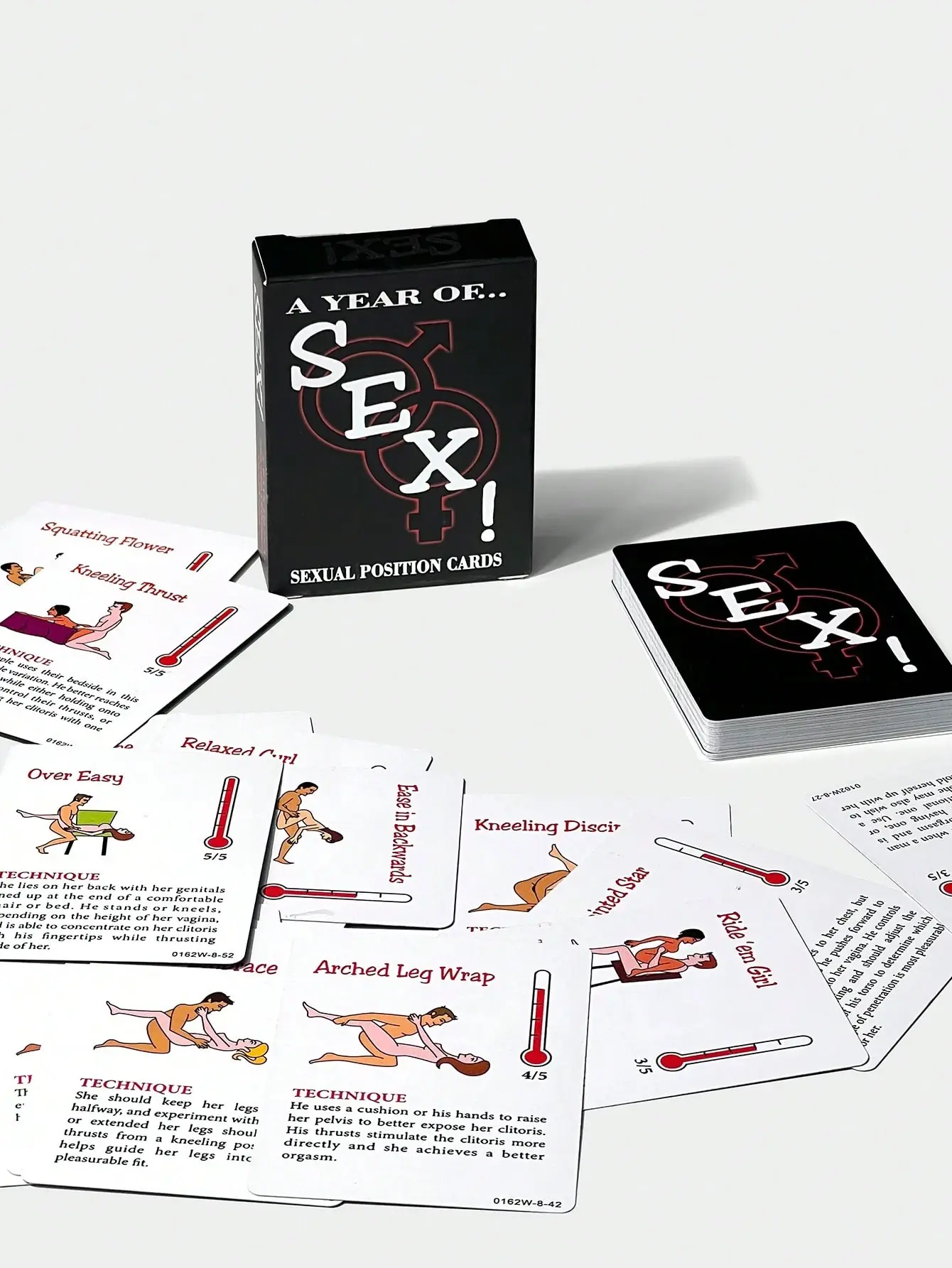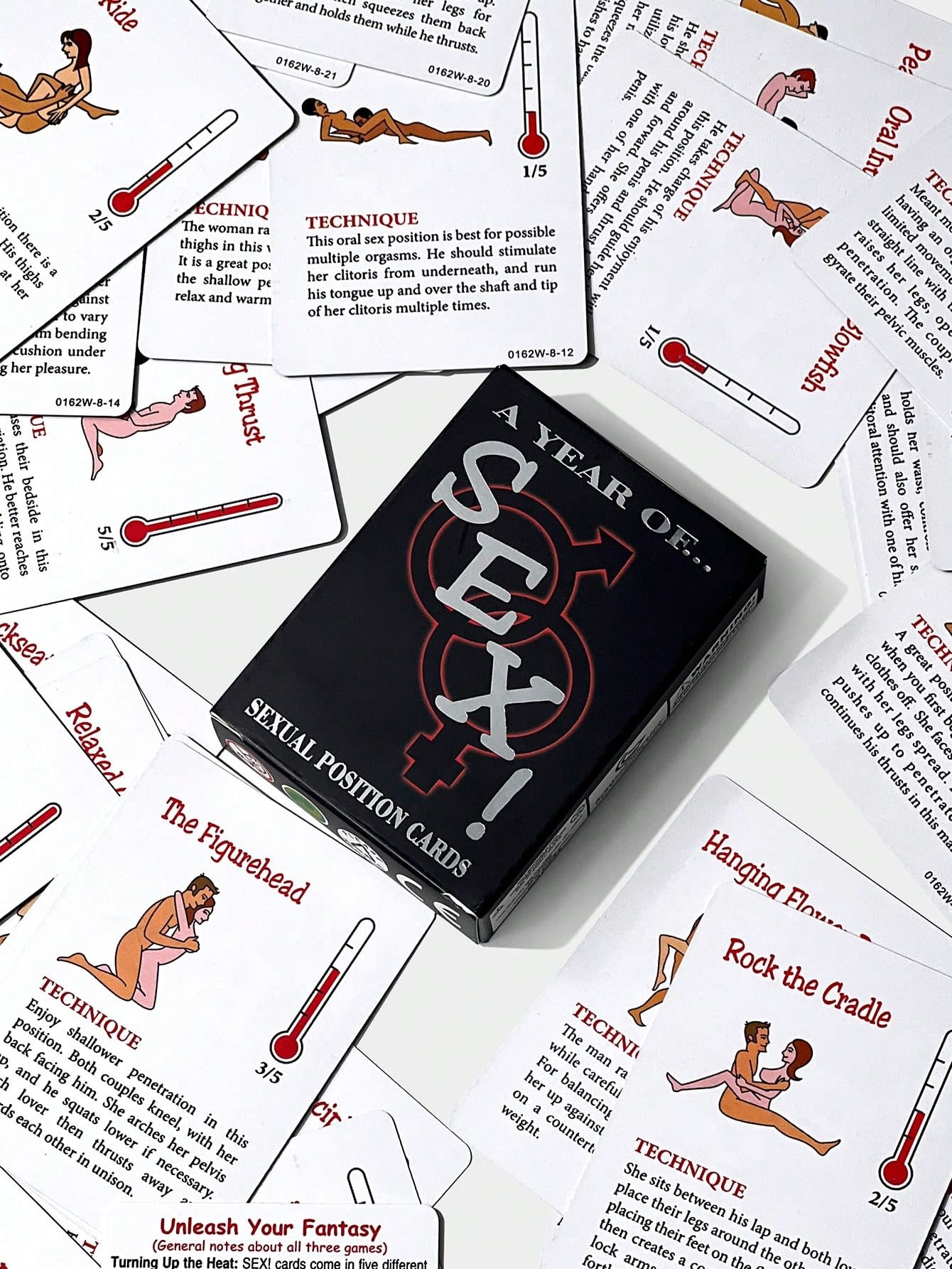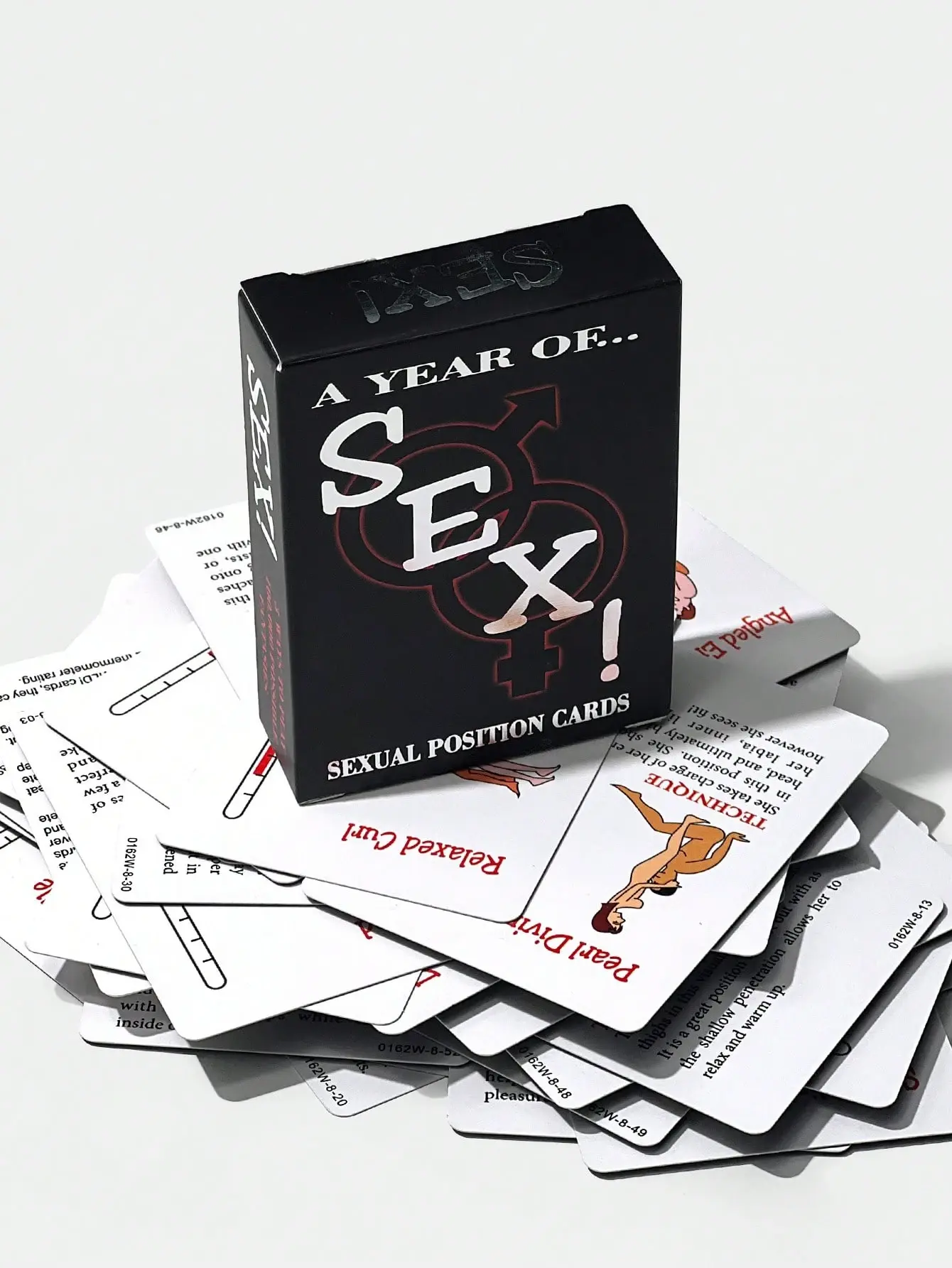 Game includes: 45 Sexual Position Cards, 5 Group Sex Cards, 3 Rule Cards, and 1 Unleash Your Fantasy Card.