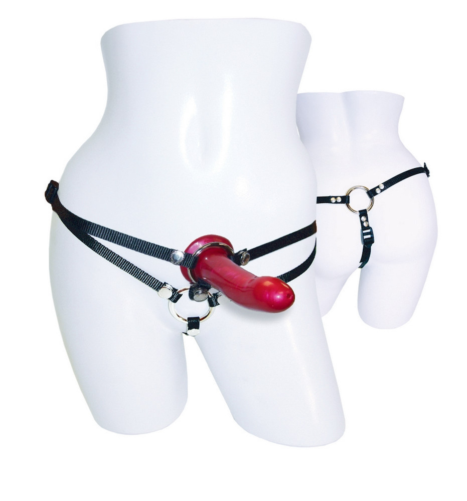 Break down barriers to your more devious fantasies with the Menage a Trois Double Dildo Harness. Now you can enact the risque rapture of double penetration without introducing a third party to your relationship. The adjustable, thong-style harness comes with a silicone dildo, two interchangeable nitrile rings, and two interchangeable metal rings. You and your lover will have all you need to create the perfect menage a trois fantasy while maintaining your comfort zone and keeping closely connected. Start small and work your way up to a longer, thicker dildo with the versatile and accommodating O rings. Use two dildos or insert your genitals into one of the rings.