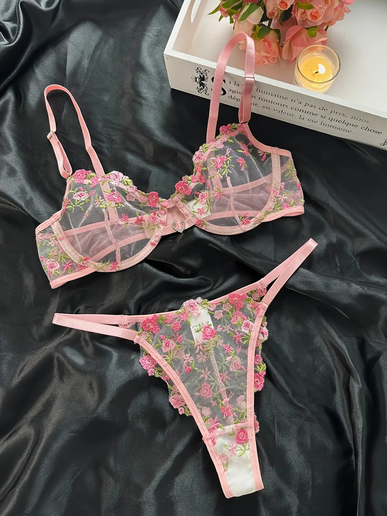 FLORAL AND LACE SHEER BRA AND PANTY SET PINK WITH UNDERWIRE