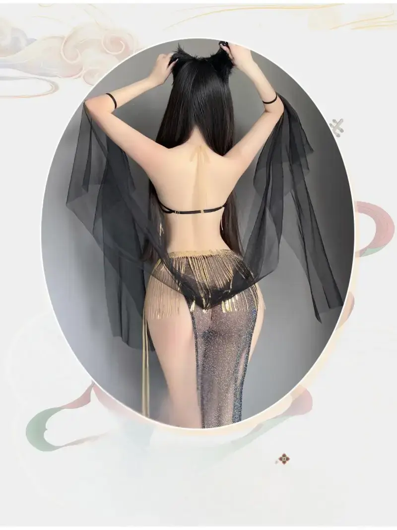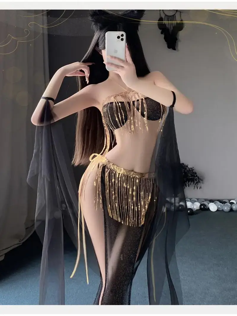 BLACK AND GOLD BELLY DANCER COSTUME SET SHEER AND FRINGE