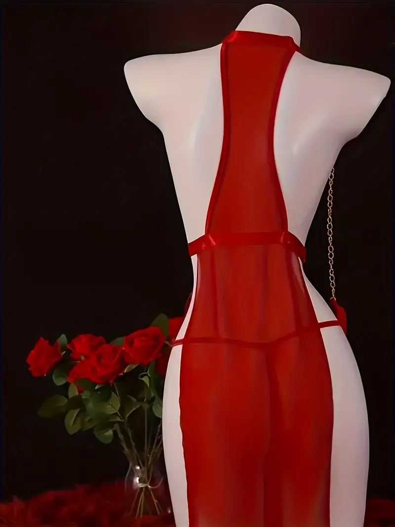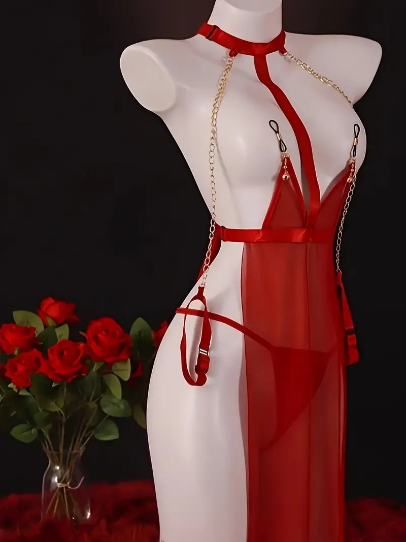 SHEER RED DRESS WITH CUFSS AND NIPPLE ATTACHMENTS ONE SIZE