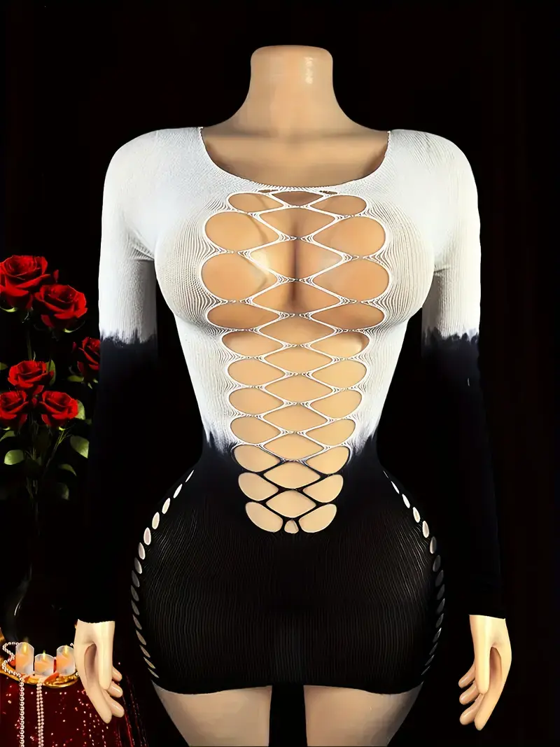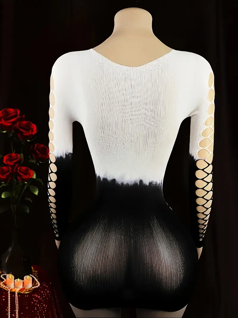 Sexy Gradient Cut-Out Mesh Bodysuit with Open Crotch and Hollow Design
