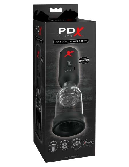Experience intense pleasure right where you want it! Powerful vibration and amazing suction surrounds the head of your penis in pure satisfaction! Enjoy a powerful pleasure combination like never before with both intense vibration and incredible suction directly at the tip of your penis. The PDX Elite Tip Teazer Power Pump provides concentrated pleasure with a soft, flexible internal vibration pad covered in teasing pleasure nubs, and a smooth, stretchy Elite Silicone donut that snugly surrounds your penis head. With an easy on and off switch, and a release button that can be pulsed for additional stimulation, you can experience a vacuum tight seal and the best blow job of your life! Ultra strong suction. Experience ultimate pleasure exactly where you want it! The Elite Silicone donut provides a tight, vacuum seal. The quick release button immediately relieves suction and can be pulsed for extra stimulation. Powerful vibrations. The strong motor provides intense stimulation! Arousing vibrations travel through the soft internal vibration pad and stimulating pleasure nubs to tease and please your penis head. Uses 2 AA batteries, not included. Smooth and stretchy Elite Silicone. Elite Silicone is the most hygienic, body safe material available on the market today and provides a tight, snug seal. Be sure to use a water based lotion like Moist with this product. Care instructions: The donut sleeve is made from Elite Silicone, the most hygienic, body safe material available. Clean up is a snap after the fun with Refresh Toy Cleaner and warm water. Be sure to use a water based lotion like Moist with this silicone piece. Features and functions: Sucks and Pumps, Vibrates, One Touch Vibrator requires 2 AA batteries, not included. Materials Silicone sleeve, ABS Plastic case. Features and benefits: Ultra Strong Suction. Powerful Vibrations. Smooth‚ Stretchy Elite Silicone. Battery operated. Specifications operating instructions: The Elite Silicone donut provides a tight, vacuum seal. The quick release button immediately relieves suction and can be pulsed for extra stimulation. Pump uses 2 AA batteries, not included. Care instructions: the donut sleeve is made from Elite Silicone, the most hygienic material available. Clean up is a snap after the fun with warm water and antibacterial cleaner. Be sure to use a water based lubricant with this Silicone piece. Package includes: 1 Tip Teazer Power Pump. Categories: Sex Toys for Men, Penis Pumps, Male Pumps, Vibrating Pumps