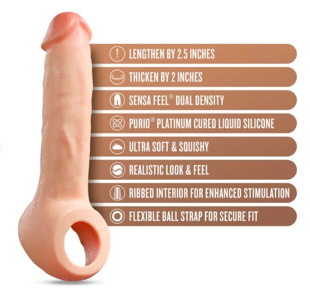 Maximize your potential with the Performance Plus Thrive Penis Extender by Blush. Designed for those who demand perfection, this 8.75-inch extender enhances both length and girth, adding an impressive 2.5 inches in length and 2 inches in girth for a more commanding presence. Thrive is crafted from Sensa Feel® Dual Density Silicone, providing a realistic, lifelike touch that’s soft on the outside and firm on the inside. The Purio® liquid silicone outer layer is luxuriously soft and 100% body-safe for unparalleled pleasure. Built for durability and comfort, Thrive offers a snug yet flexible fit that adapts to your body, enhancing every experience with intensified impact and control. The secure ball strap holds it firmly in place, ensuring you’re always ready to perform at your best. Elevate your game and boost your power with renewed strength and Thrive.