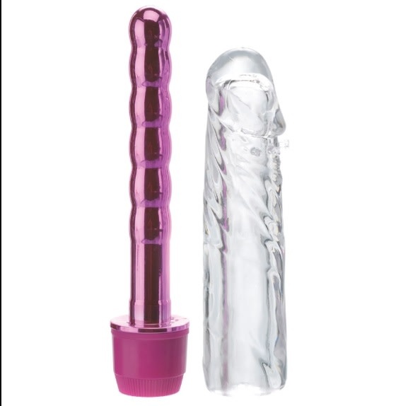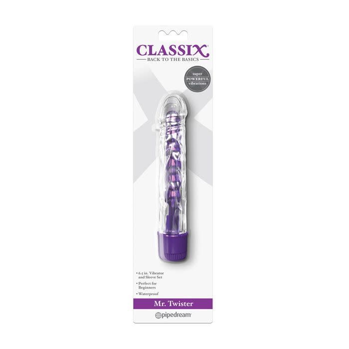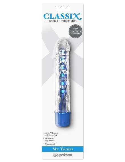 With his crystal clear sleeve and shiny metallic insides, Mr. Twister is the right man for the job! Turn the dial on the multi-speed base and let the powerful vibrations whisk you away! The soft, body-safe sleeve has a veiny swirl texture, lifelike head, and tiny ticklers for extra stimulation. Best of all, the removable sleeve can be used as a penis extension and the beaded vibe can be used alone for vaginal or anal play. Cleanup is a snap after the fun with toy cleaner and warm water. Perfect for Beginners.