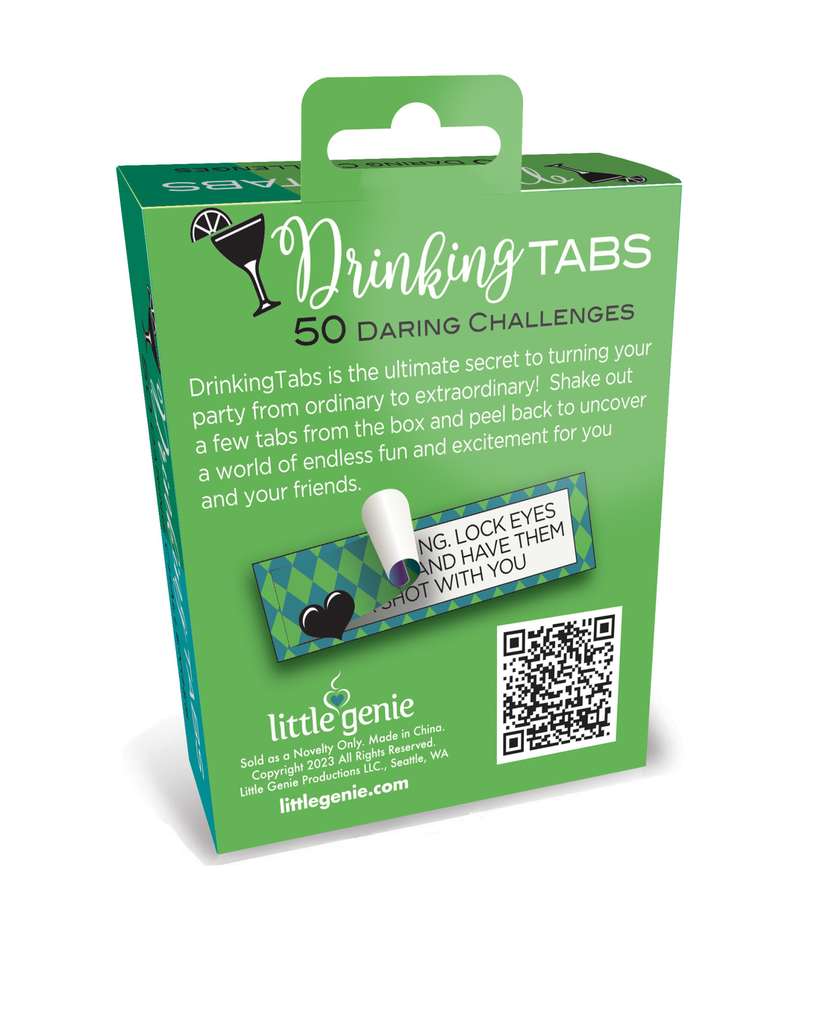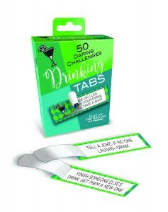 Drinking Tabs 50 Daring Challenges from Little Genie. Drinking Tabs is the ultimate secret to turning your party from ordinary to extraordinary! Shake out a few tabs from the box and peel back to uncover a world of endless fun and excitement for you and your friends. With fifty unique drinking challenges and activities, these pull tabs are guaranteed to lead to a night filled with laughter. So grab a drink, peel a tab, and let the good times roll! Each box contains 50 drinking activites!