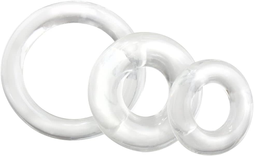 Helps keep him harder longer with stronger, fuller and firmer erections. Package includes three unique super-stretchy sizes. Choose from Stronger, Firmer or Harder tensions. Stretch the ring around the penis and testicles and wear at the base of the body to allow the snug cock ring to do its job. Allows erections to last longer while helping prevent premature ejaculation, while increasing orgasmic intensity.