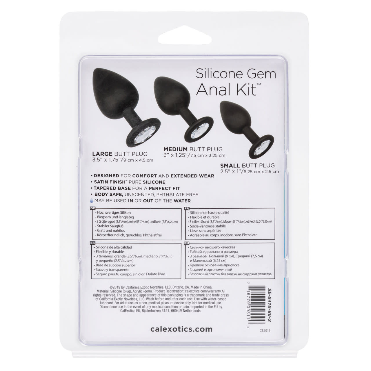 "Open the door of thrilling anal sensation with the Silicone Gem Anal Exerciser Kit™. This glamorous kit includes a set of 3 graduated anal plugs with a gem base to let you safely and comfortably increase passionate anal stimulation. To enjoy everything the exhilarating world of anal play has to offer, training is in order to ensure total safety and satisfaction. Each probe in our kit gradually increases in length and girth for superb pleasure at any level of pleasure play. While each increase of your training expands your horizons, use the sparkling gem adorned base for steamy stimulation, effortless insertion and gentle removal. The flexible probes are made from a smooth, seamless Satin Finish™ silicone. This body safe material is unscented and phthalate free to keep your most sensitive spots happy and healthy "
