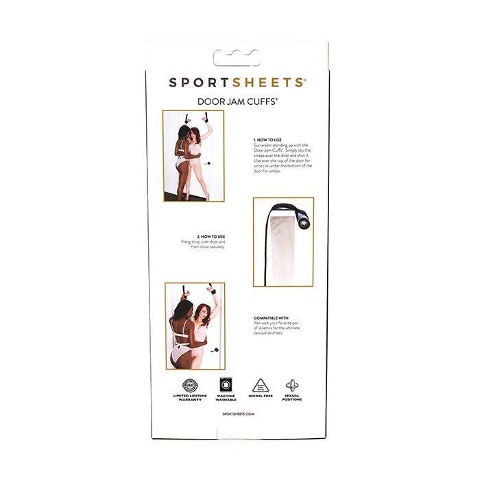 With a pair of Door Jam Cuffs by Sportsheets, you can use any door in your home as a bondage stage. Just Velcro the comfortable cuffs around wrists or ankles, slide the tubes and webbing over or under the door, latch it shut and you've got your partner restrained for all kinds of sexual fun! No installation required. Slip the straps over the door and close the door. Approximately 8.5" of the strap will attach to the cuffs. Slide cuffs on top of the door for wrists or under the door for ankles. Ingredients: Velboa fabric, polypropylene webbing, nickel-free hardware, Hook & Loop, plastic tube and cap Includes: 2 Wrist/Ankle cuffs attached to 2 door straps