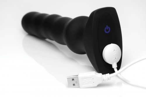 Thunderplugs Vibrating and Squirming Silicone Plug with Remote Control Black from XR Brands. Enjoy undulating pleasure as the plug ripples inside you! Experience 3 levels and 5 patterns of vibration, as well as 5 incredible speeds of wriggling and writhing. The shape of the plug will massage you as you slide it in and out, but the 5 bulbs also have an additional feature: they move back and forth inside you! An optional remote control is included for more convenience during solo play and more excitement during partner play. This rechargeable and waterproof pleasure tool is made of premium silicone for a body safe experience. This non-porous and phthalate free material can be cleaned with mild soap or toy cleaner, but is not compatible with Silicone lubricants. Measurements: 7.5 inches in total length, 6.5 inches insertion length, 1.75 inches at widest diameter. Remote Control is 3.15 inches in length, 1.7 inches is width. Materials Silicone Plug, ABS Plastic Remote Control. Color: Black. Please note: Plug charges magnetically via USB. Remote Control uses 1 CR2032 cell battery, included.